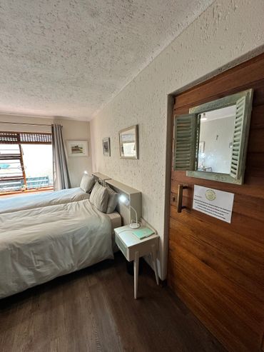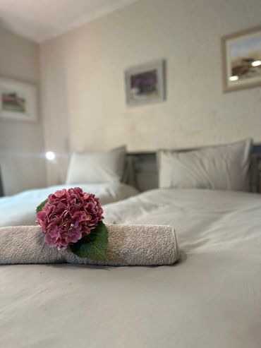 The room comfortably accommodates two guests in twin single beds with crisp, fresh linen, soft towels, and a modern ensuite bathroom for your privacy. A separate private entrance ensures independence and discretion, while a small lounge area provides a cozy space to relax after a day of exploring.